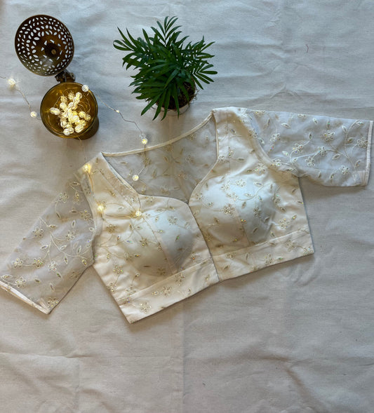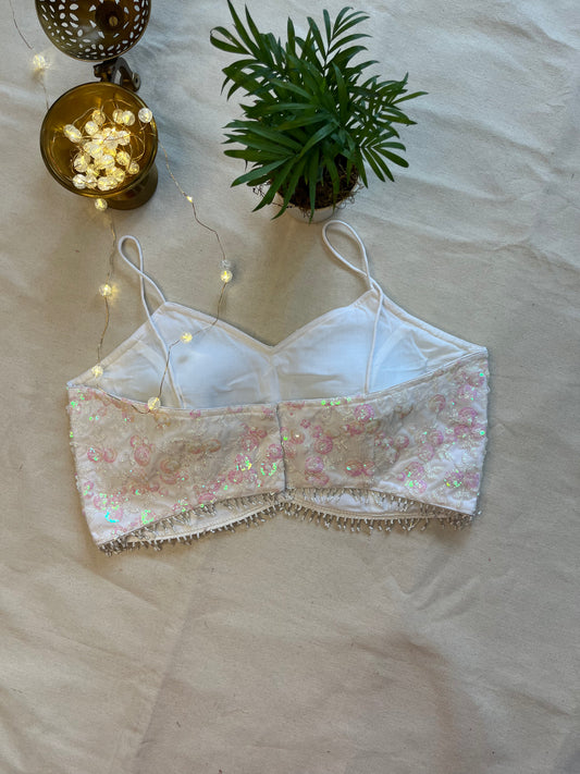Pearl White Noodle Strap Blouse in Delicate Net Fabric with Sequins Embroidery – Ethereal Glamour