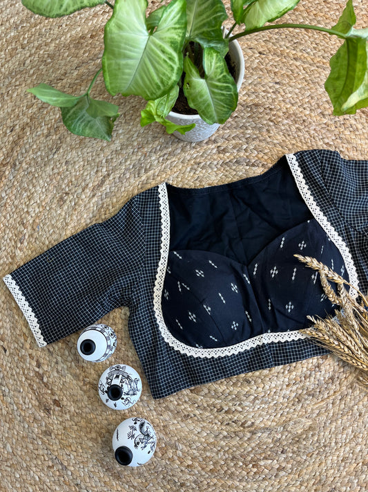Timeless Ebony Handloom Jacquard Cotton Blouse with Graceful Lace Detailing