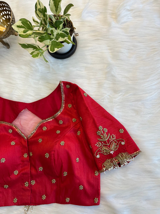 Artisan Ruby Red Bridal Blouse with Beaded Detailing