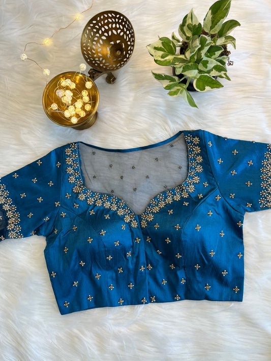 Teal Blue Bridal Zardozi Blouse - Exquisite Raw Silk Fusion for a Majestic Wedding Look