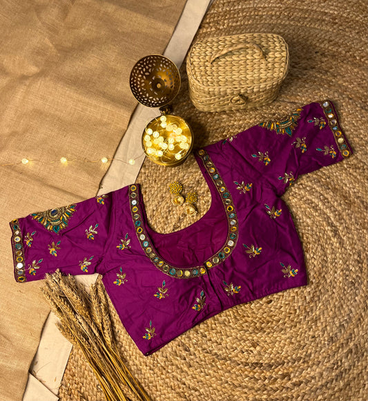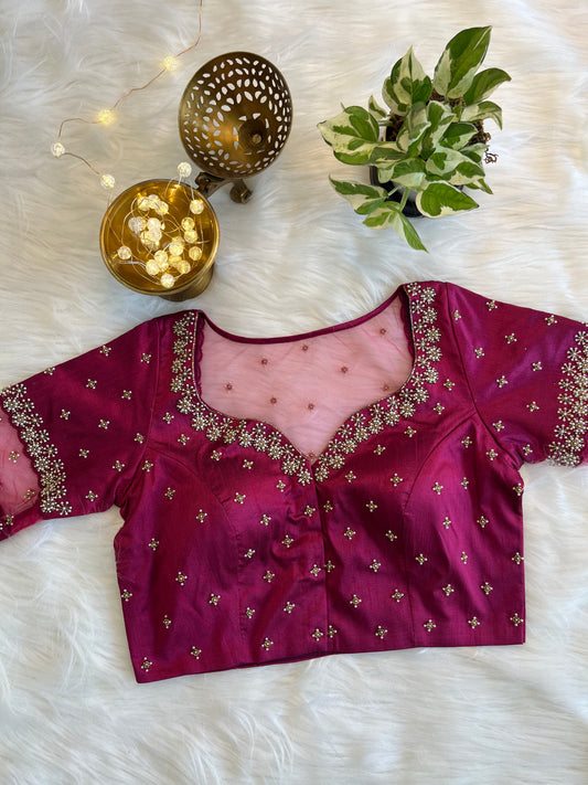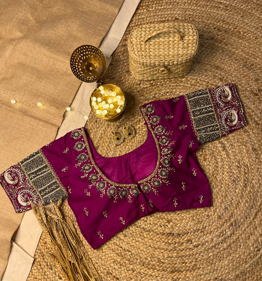 Purplish Red Zardozi Front-Open Blouse - Exquisite Raw Silk Fusion for Festive Elegance