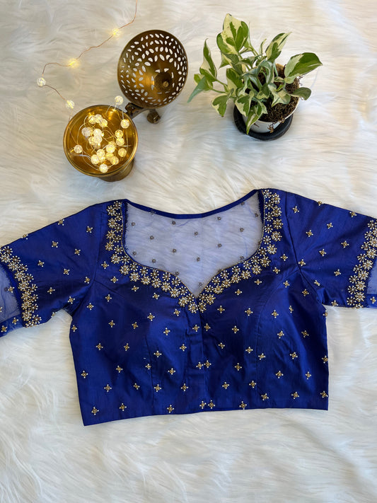 Royal Blue Zardozi Backless Blouse with Net Detailing - Luxurious Raw Silk Fusion