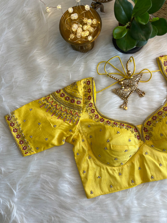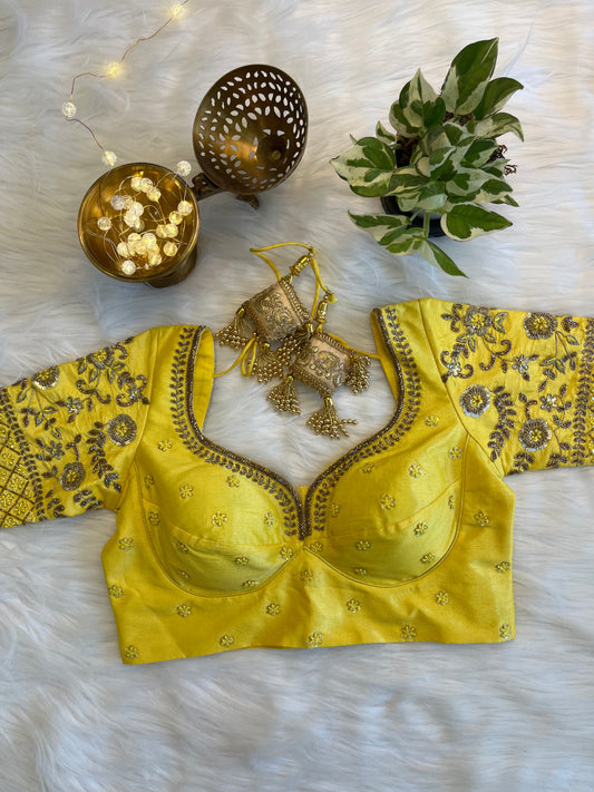 Vibrant Yellow Zardozi Blouse - Premium Raw Silk Fusion for Festive Glamour