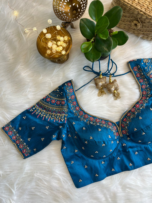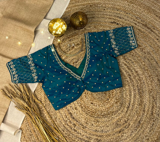 Teal Blue and Green Bridal Blouse with Handcrafted Zardosi