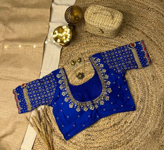 Royal Blue Zardozi Front-Open Blouse - Elegant Raw Silk Fusion for Festive Glamour