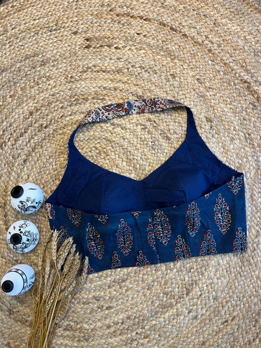 Elegant Ajrakh Indigo Halter neck Blouse with Artistic Prints