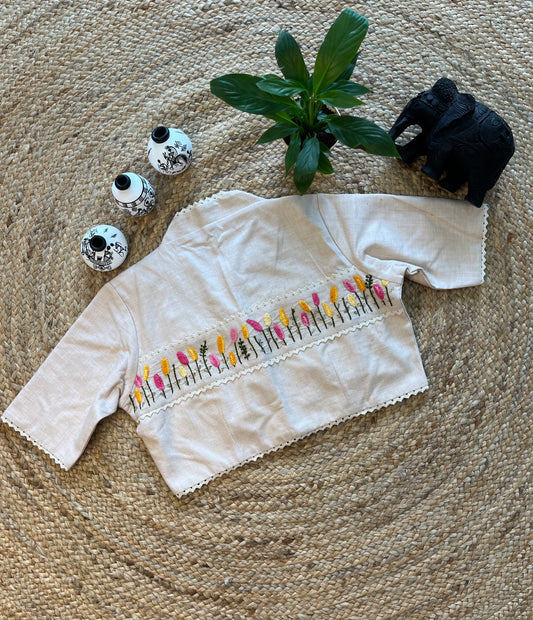 Beige Cotton Blouse with Intricate Thread Work and Collar Neck – Timeless Sophistication
