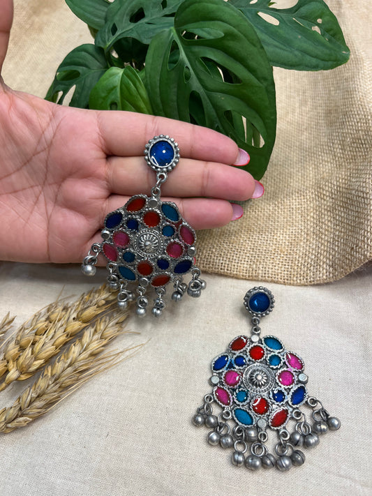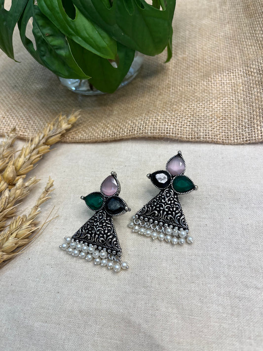 Oxidized Silver Jhumka Earrings with Multicolor Stone Drops