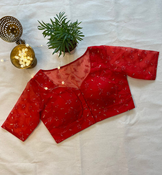 Cherry Red Organza Blouse with Lustrous Sequins Embroidery – A Radiant Statement of Elegance