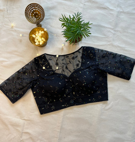 Midnight Black Organza Blouse with Exquisite Sequins Embroidery – Timeless Elegance