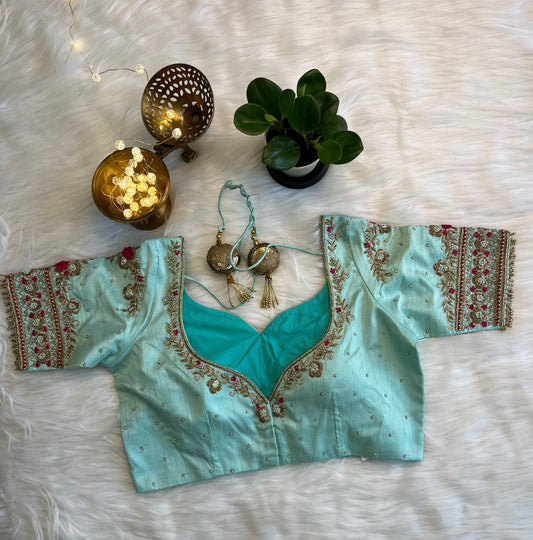 Fusion Silk Aqua Sea Green Blouse with Zardozi Work