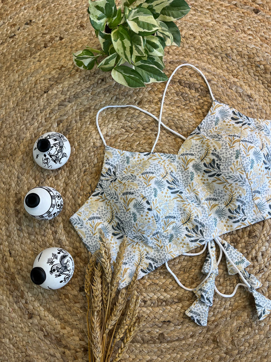 Hakoba Digital Print Noodle Strap Corset Blouse – White & Multi-Color Cotton Elegance