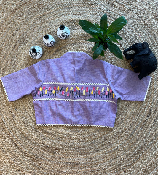 Lavender Cotton Blouse with Delicate Thread Work and Classic Collar Neck – Ethereal Elegance