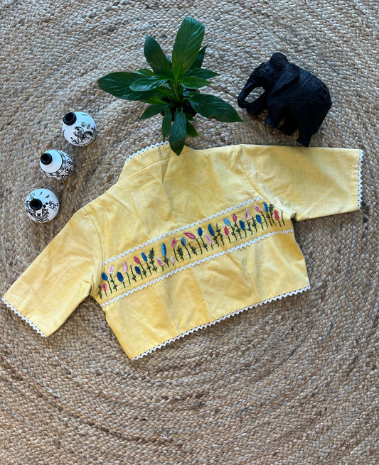 Pale Yellow Cotton Blouse with Exquisite Thread Work and Classic Collar Neck – Serene Sophistication