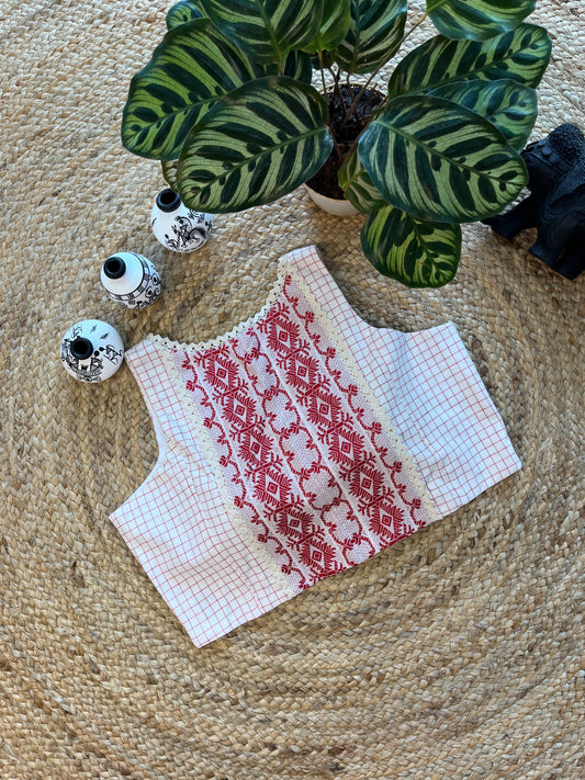 Red Cotton Jacquard Sleeveless Blouse with Lace Detailing – Effortless Elegance