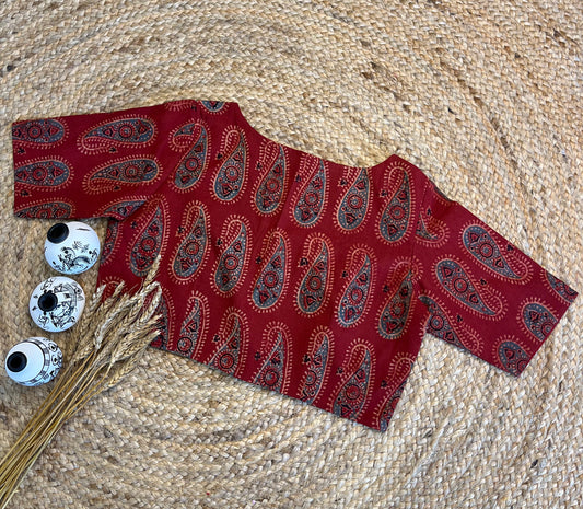 Vibrant Red Front-Open Ajrakh Blouse with Artistic Prints