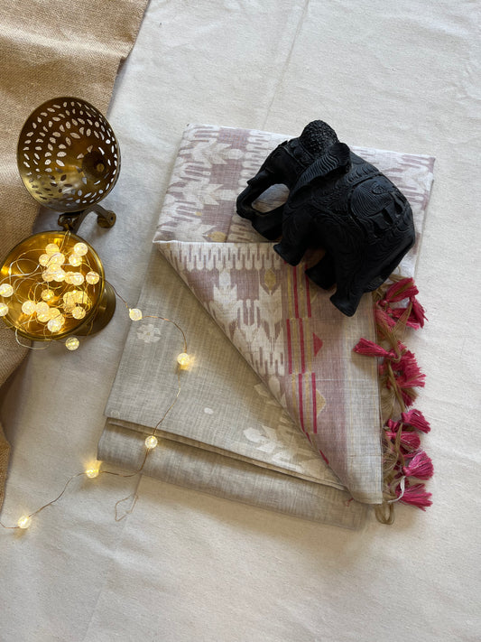 Chic Linen Saree with Lacy Border – Modern Handloom Design